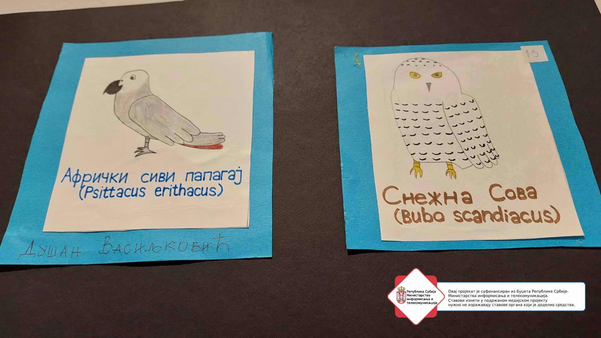 - Dušan je veoma rano pokazao interesovanje za crtanje. Kada je imao 8-9 godina već je znao lepo da crta, a vremenom se to sve više razvijalo. Veoma rano je on naučio da čita i piše. Kada smo nekom prilikom primetili kako čita, svi smo se veoma iznenadili, on tada još ni u školu nije krenuo. Što se crtanja tiče, primećujem da njegovu pažnju okupiraju životinje, koje su često motivi na njegovim radovima. Nekada su to bile zastave zemalja. Mislim da ne postoji zastava države koju on ne zna. Takođe, voli da crta i istorijske ličnosti koje su očigledno njemu bitne, odnosno značajne, ali i verske objekte. Tako se na Dušanovim radovima pojavljuju Knez Lazar, Despot Stefan, hram Svetog Save i dr. On ima dara kada je likovna umetnost u pitanju. Očigledno je taj dar, talenat nasledan, ima takvu genetiku.