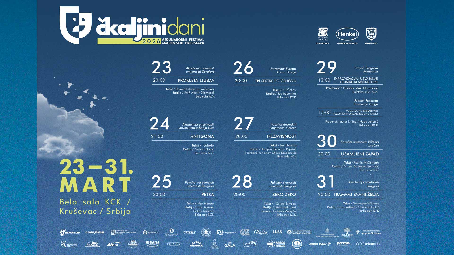 Sve predstave održaće se u Kulturnom centru Kruševac (KCK), a ulaz je besplatan. Karte se mogu rezervisati na broj +381 63 8366997 ili putem mejla ckaljinidani.ulaznice@gmail.com